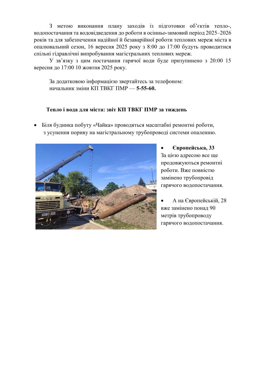 НОВИНИ КП ТВКГ ПМР попереджує про відключення горячого водопостачання П'ятниця, 12 вересня 2025 < Попередня Наступна >