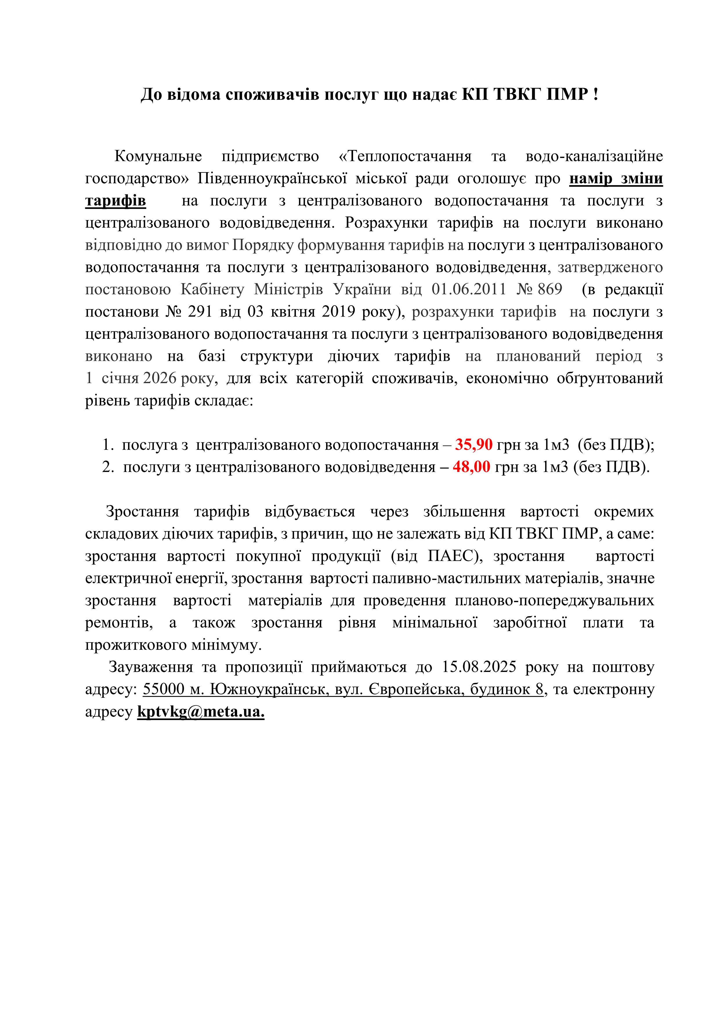 НОВИНИ Про намір зміни тарифів на послуги з централізованого водопостачання Четвер, 07 серпня 2025 < Попередня Наступна >